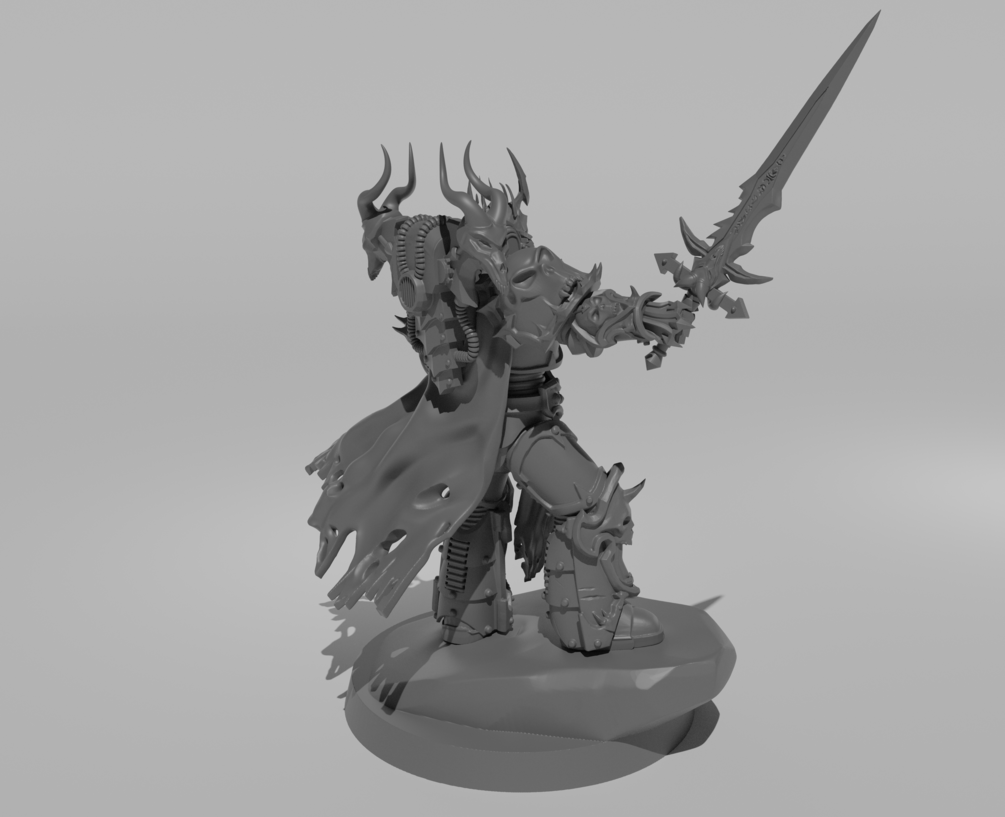 Print ready 3D model Lich Lord of Chaos, meant as a proxy chaos lord in power armor for WH40k based on a mix of the standard chaos armor style and the armor of the Lich King from WoW. Model is multipart so arms/head/backpack/hands should all be pretty is to swap with actual GW plastic bits.